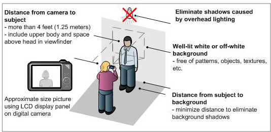 Use fairly neutral, balanced lighting in the room where you take your picture. You should not have any shadows cast on your face in any direction.